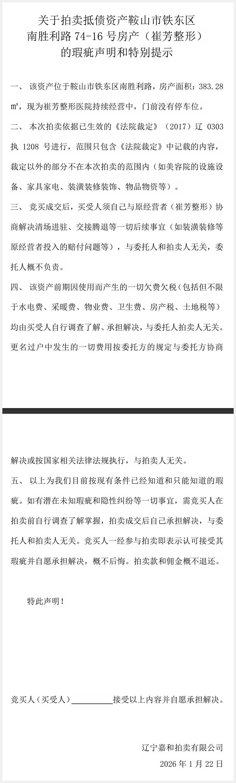 提示:以上拍賣的標的物所有欠費和更名過戶(有可能需辦理兩次)所產生的各項稅費均由買受人承擔解決或按委托方相關規(guī)定執(zhí)行;按標的物拍賣日實際現狀進行拍賣;標的物的所有瑕疵均由競買人在拍賣前自行調查了解,成交后自己承擔解決,委托方拍賣方不承擔其瑕疵擔保責任。