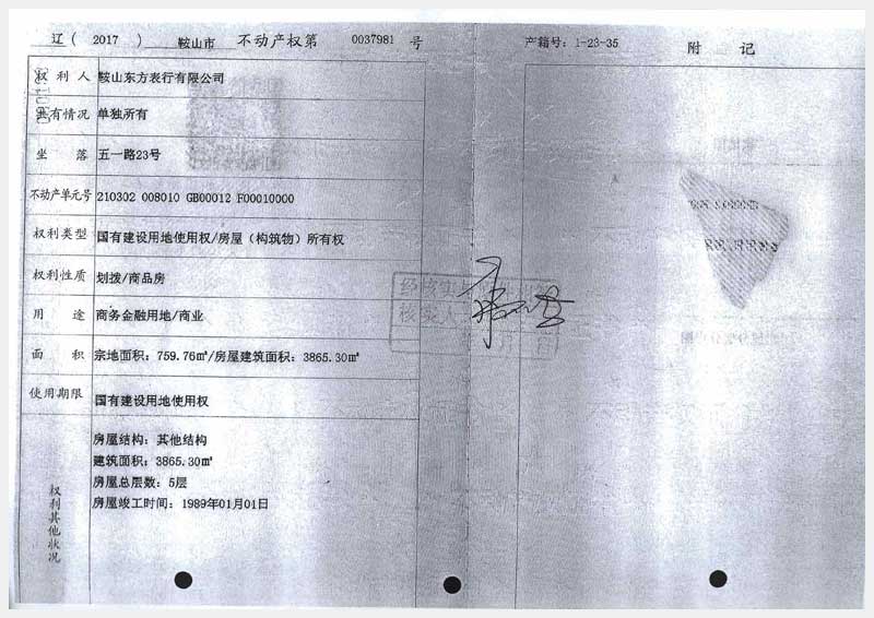 名稱:鞍山市鐵東區(qū)五一路23號房產(chǎn) 面積:3865.3㎡ 瀏覽次數(shù):1069