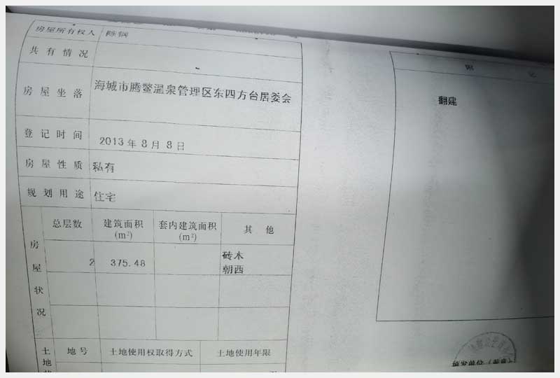 名稱:海城市騰鰲溫泉管理區(qū)東四方臺(tái)房產(chǎn) 面積:375.48㎡ 瀏覽次數(shù):1559