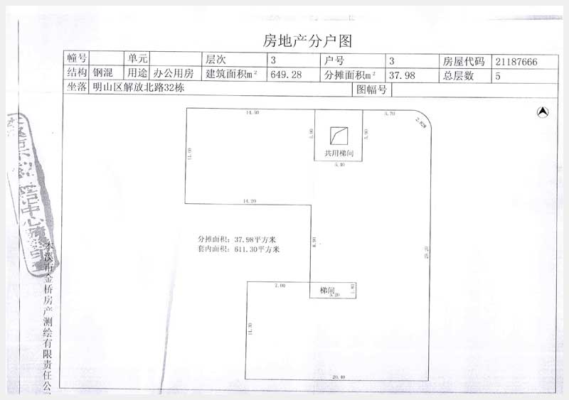 名稱:本溪市明山區(qū)解放北路32東3層房產(chǎn) 面積:649.28 ㎡ 瀏覽次數(shù):1114