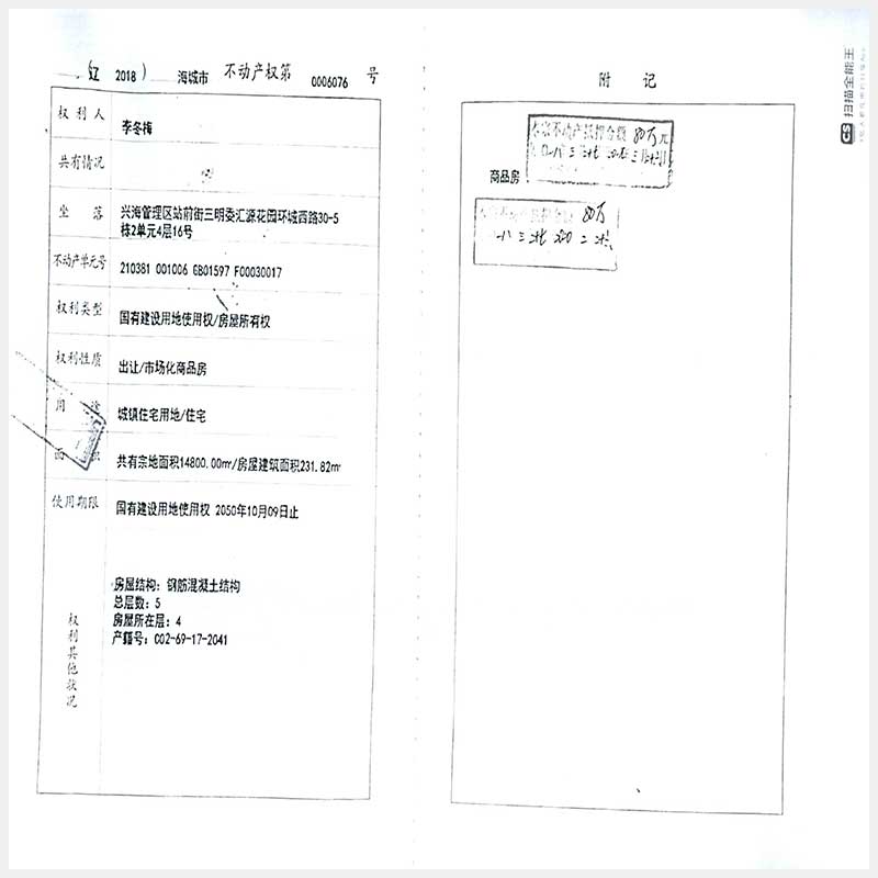 109號 海城市興海管理區(qū)站前街三明委匯源花園環(huán)城西路30-5棟2單元4層16號房產(chǎn)