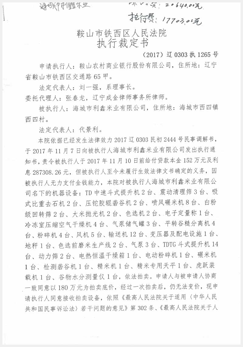 名稱:海城市利鑫米業(yè)有限公司所有的機(jī)器設(shè)備 面積:87臺 瀏覽次數(shù):2103