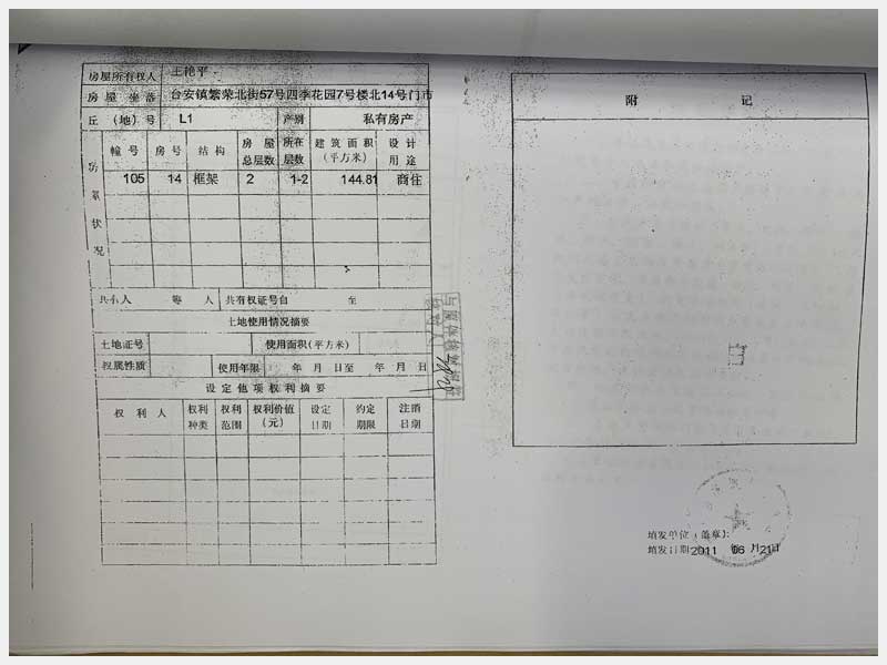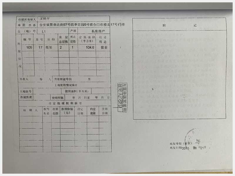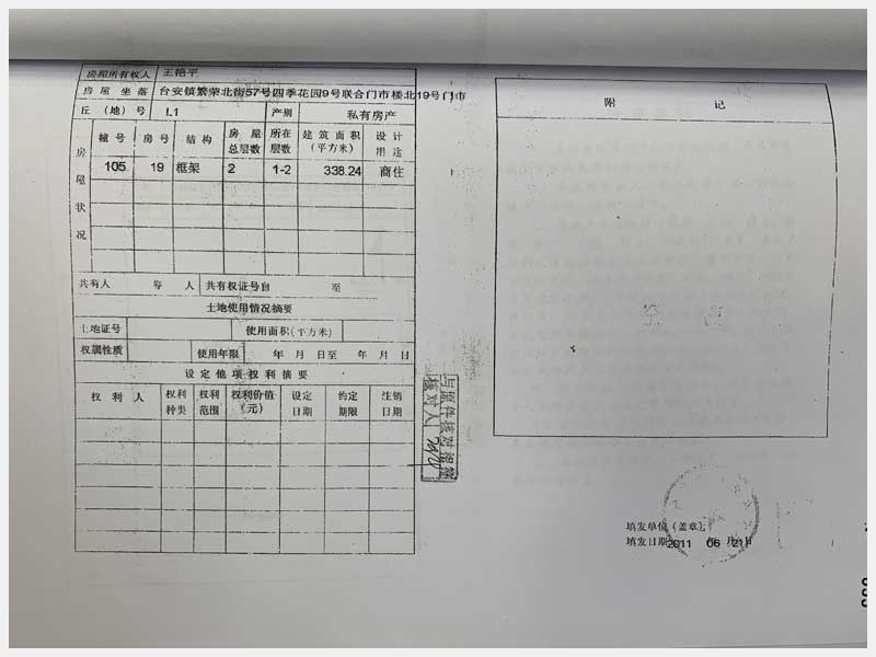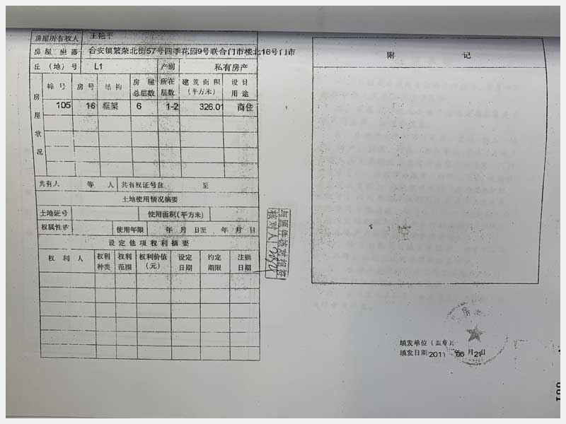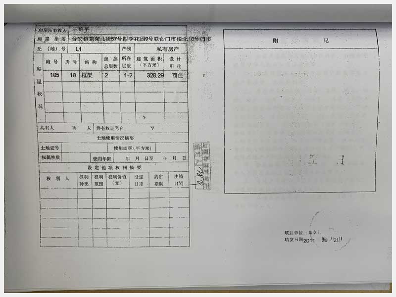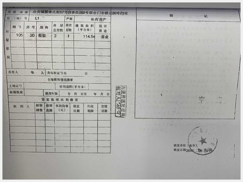 名稱:臺(tái)安縣臺(tái)安鎮(zhèn)繁榮北街57號(hào)四季花園門市樓13、14、15、16、17、18、19、20號(hào) 面積:13號(hào):220.85㎡、14號(hào):144.81㎡、15號(hào):57.22㎡、16號(hào):326.01㎡、17號(hào):104.6㎡、18號(hào):328.29㎡、19號(hào):338.24㎡、20號(hào):114.54㎡ 瀏覽次數(shù):1619